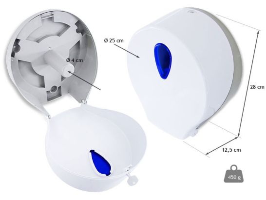Rollenhalter für Industrie-Toilettenpapier kompatibel mit Rollen bis 24 cm Durchmesser und 12 Breite.
