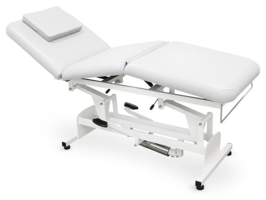 Table hydraulique multidisciplinaire sensationnelle à 3 sections avec pli central et porte-rouleau de papier toilette. Pédale sur la base, accessible des deux côtés, pour régler la hauteur générale du brancard. Cadre en acier pour une stabilité et une résistance maximales. Rembourrage disponible en différentes couleurs.