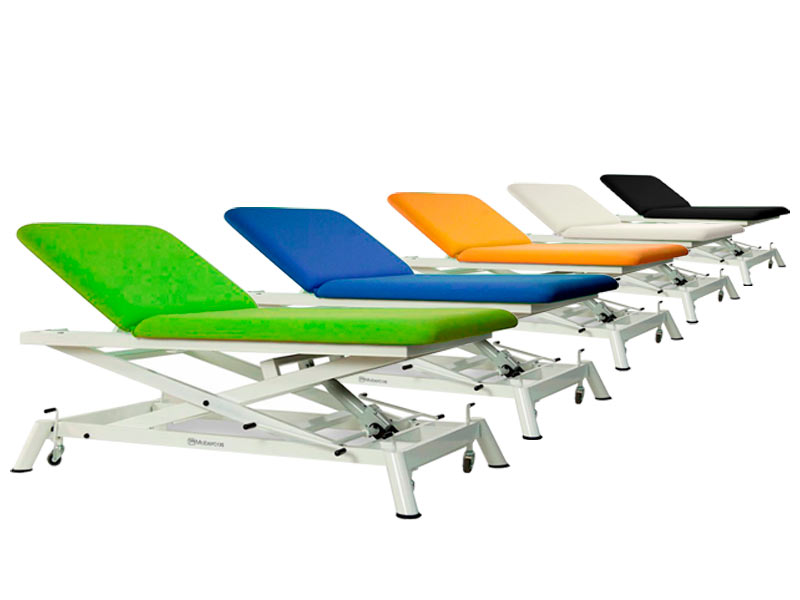 Civière hydraulique type ciseaux Bobath à 2 sections à montée droite sans mouvement latéral et à roues escamotables. 190x100 ou 200x120.