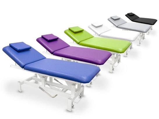 Hydraulische behandeltafel 2 secties, met wielen en spleetregelaar in een van de poten, gezichtsgat, kussenplug en metalen papierrolhouder.