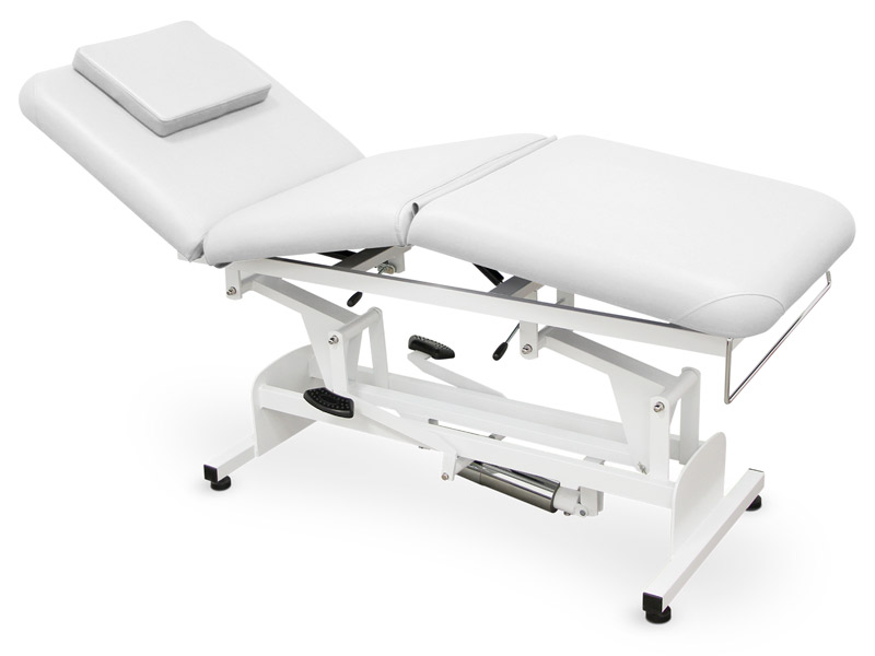 Table hydraulique multidisciplinaire sensationnelle à 3 sections avec pli central et porte-rouleau de papier toilette. Pédale sur la base, accessible des deux côtés, pour régler la hauteur générale du brancard. Cadre en acier pour une stabilité et une résistance maximales. Rembourrage disponible en différentes couleurs.