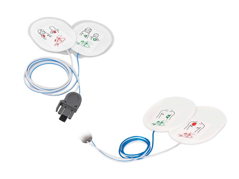 Elettrodi per defibrillatore Reanibex 200 con anello adesivo in versioni adulto e pediatrico.