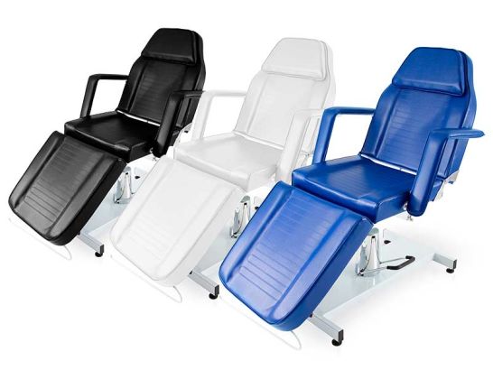 Poltrona a sollevamento idraulico girevole a 360º sul suo asse per adattarsi alle esigenze dell'utente. Dotata di portarotoli, poggiabraccia removibili e copertura foro viso con cuscino.