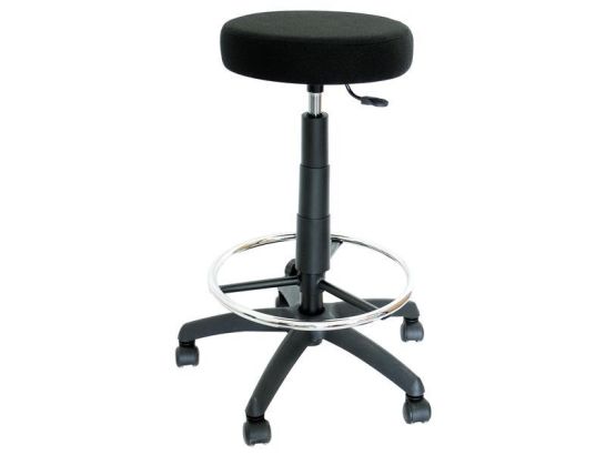 Sgabello girevole con ruote con alzata a gas, molto versatile e per uso domestico. Ha un anello poggiapiedi regolabile in altezza e un sedile imbottito di grande comfort grazie al suo spessore e all'imbottitura interna in schiuma ad alta densità.
