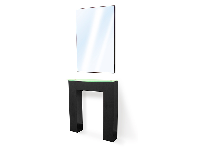 Nuova vanità dal design moderno e minimalista con specchio autoportante, ideale per saloni di parrucchieri. Struttura in legno nero con piano di appoggio in vetro traslucido.