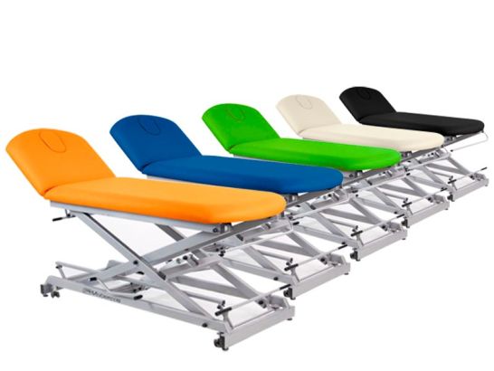 2-sekční hydraulická vyšetřovací nosítka s negativně sklopným opěradlem a výsuvnými koly. Rovné stoupání bez posunu. Čepice na obličej a držák toaletního papíru.