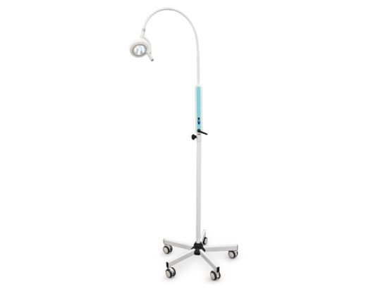 LED diagnostická a vyšetřovací lampa s rolovací základnou a technologií Touchlees pro regulaci jasu. Dlouhé vícepolohovatelné flexibilní rameno. Platí pro více disciplín.
