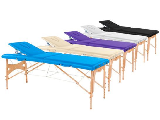 Skládací ošetřovací stůl Ecopostural s opěradlem. Vyrobeno z hliníku s povrchovou úpravou dřeva.