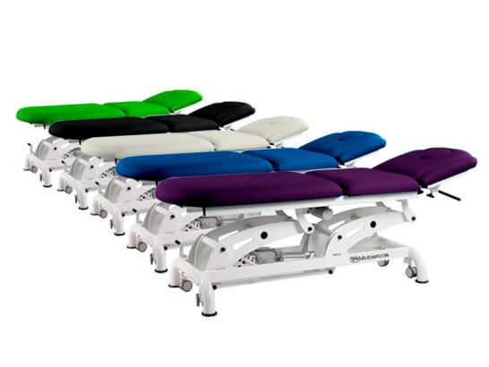 3-teilige elektrische Trage mit Armlehnen an der Rückenlehne, höhen- und öffnungsverstellbar, mit einziehbaren Rädern und Gesichtskappe.