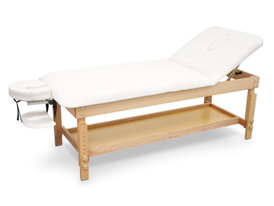 Feste Holztrage mit verstellbarer Rückenlehne und großem Ablagefach. Sie bietet hochwertige Verarbeitung, abnehmbare Kopfstütze und maximale Stabilität. Ideal für Physiotherapie und Ästhetik, belastbar bis 220 kg.