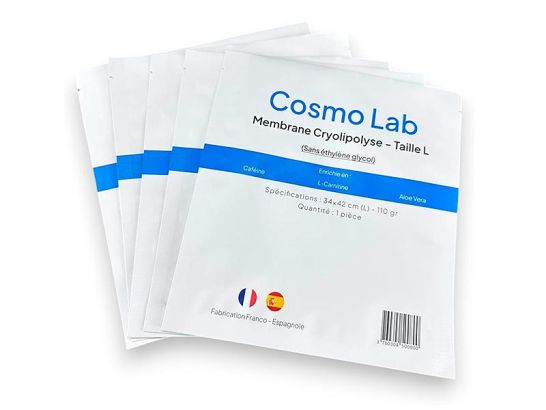 Las membranas cryplipolysis COSMO LAB CLINIC se fabrican en España. Te garantizan una seguridad y trazabilidad controladas. Son compatibles con todos los dispositivos. Hasta la fecha, es la única membrana libre de etilenglicol enriquecida con Cafeína, L-Carnitina y Aloe Vera, que le ofrece más resultados en quema de grasa durante la sesión e hidratación de la piel con Aloe Vera. Su gran tamaño de 34 x 42 cm (110 gr) le garantiza una superficie de trabajo para los mangos más grandes.