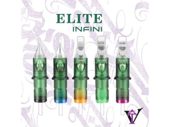 Cartuchos Elite INFINI para tatuajes. Alta calidad y precisión con punta suavizada para un deslizamiento perfecto. Esterilizados con gas EO.