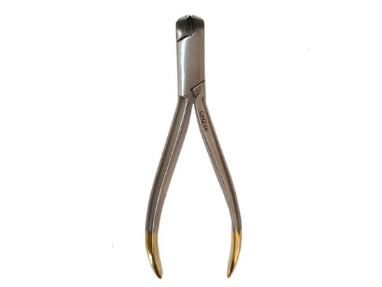 Alicate profesional de 14 cm con acabado en tungsteno para cortes precisos y duraderos en alambres de ortodoncia y prótesis, con diseño ergonómico y resistente a la corrosión.