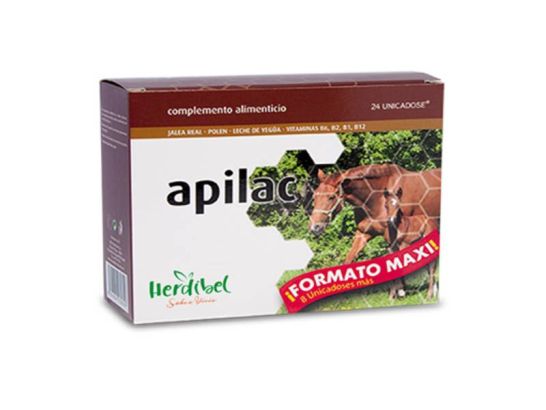 APILAC MAXI 24 ampollas es un suplemento alimenticio que combina los efectos de la jalea real, el polen de abejas, la leche de yegua atomizada y varias vitaminas esenciales para mejorar la salud y el bienestar general.