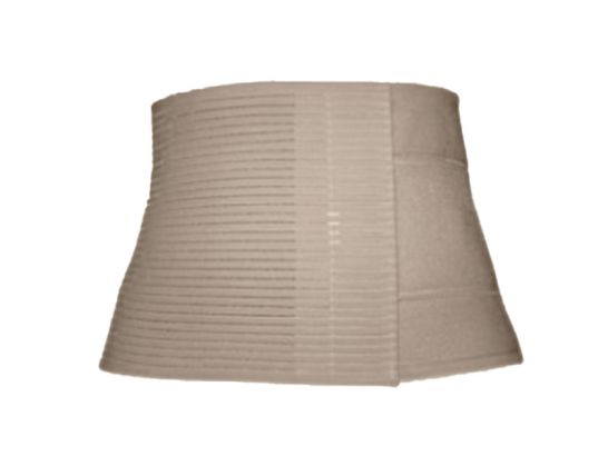 De tejido elástico transpirable de color beige. posee una sola banda elástica transpirable de 240 mm. de ancho, que se ajusta al cuerpo mediante cierre velcro y ejercen presión en la zona lumbar y sacra.