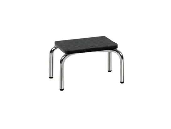 Banqueta de un peldaño de acero cromado con superficie de gona rayada antideslizante.