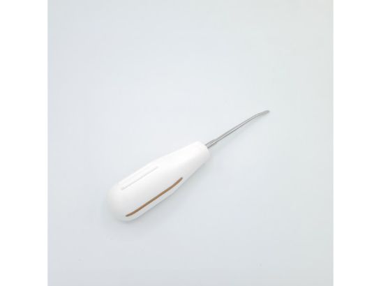 Botador dental con mango plástico y hoja curva de 3 mm, diseño ergonómico para extracciones precisas, cómodo y seguro para uso profesional en procedimientos dentales.