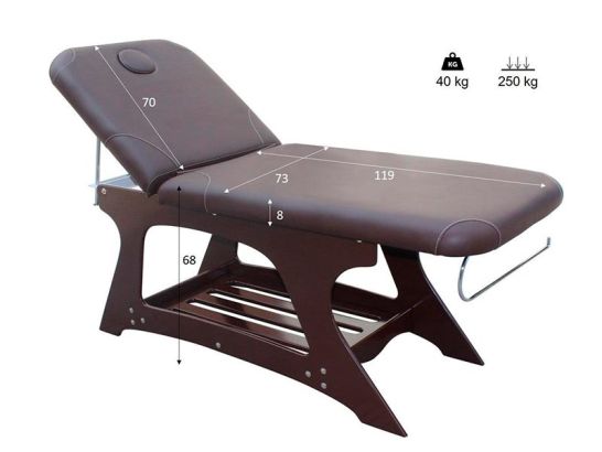 Camilla de masaje VIRTUS en madera con respaldo reclinable y acolchado de 8 cm, diseño ergonómico y resistente para sesiones cómodas y profesionales.