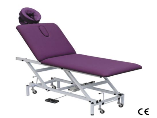 Camilla eléctrica robusta con pedal neumático y cabezal ajustable. Ideal para tratamientos profesionales. Fácil de trasladar y usar.