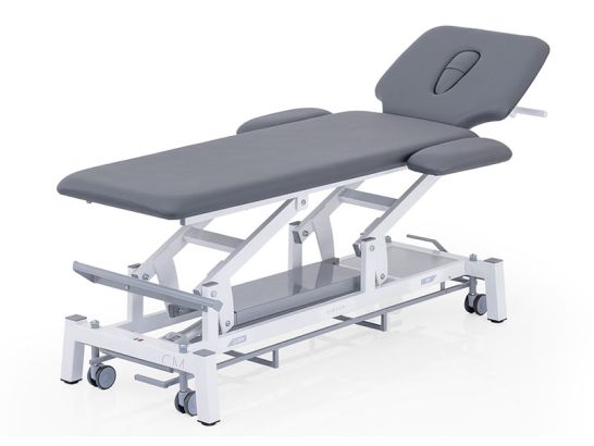 - Camilla eléctrica profesional de cuatro cuerpos para fisioterapia con reposacabezas regulable positiva y negativamente mediante pistón de gas y giro de 90°. apoyabrazos plegables.