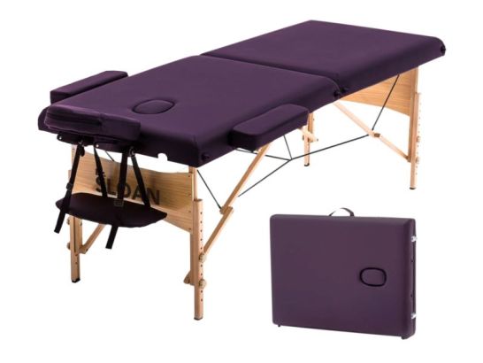 Camilla plegable de madera Sloan, ideal para masajistas y fisioterapeutas. Tapizado de polipiel resistente, regulable y fácil de transportar. ¡Práctica y duradera!