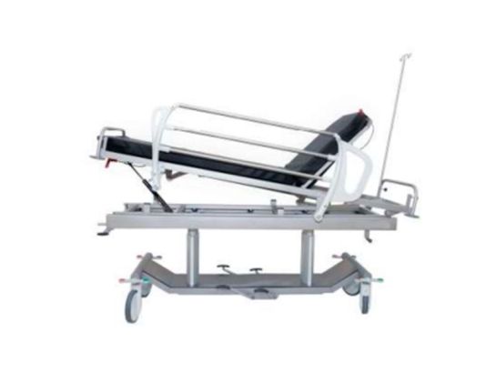 Camilla transfer con elevación hidraulica y 4 ruedas con freno interconectadas