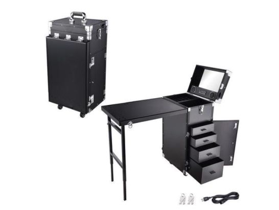 Carro trolley con mesa integrada, ruedas bloqueables y cerradura, ideal para profesionales de estética, maquillaje, manicura y tatuajes en movilidad.