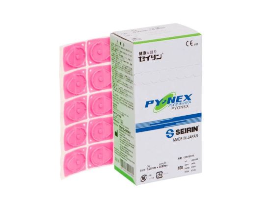 Agujas Pyonex Verde de auriculoterapia y acupuntura corporal, 0.20x1.5 mm, 100 unidades con adhesivo circular transpirable de 10Ømm. Perfectas para terapias prolongadas y sensibles, incluyendo niños. Su esparadrapo de calidad asegura una fijación duradera y una estimulación precisa mediante presión digital.