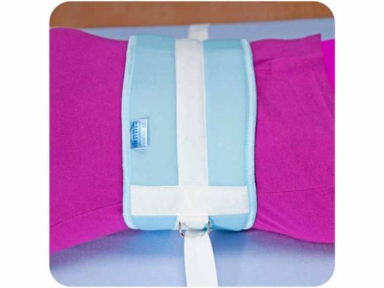 Aplicación: Coloque el cinturón alrededor de la cintura del paciente. Cruce las cintas por detrás y anúdelas a ambos lados del bastidor de la cama. El paciente podrá girar 90 grados hacia cada lado sin peligro de caída. Si desea mayor sujeción vuelva a pasar las cintas a través de las anillas laterales y átelas de nuevo al bastidor.