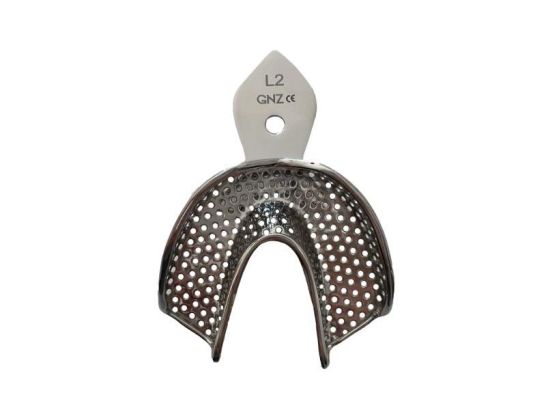 Cubeta perforada en acero inoxidable L2 para impresión dental precisa, duradera y fácil de esterilizar. Ideal para profesionales odontológicos y laboratorios.