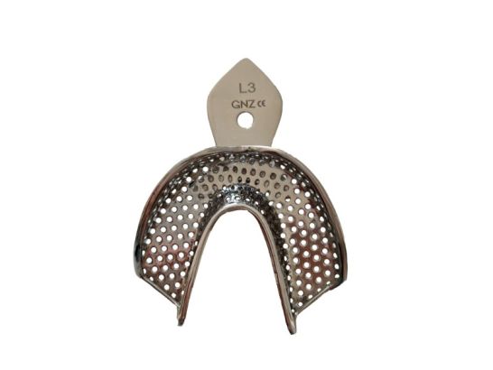 Cubeta perforada en acero inoxidable L3, ideal para toma precisa de impresiones dentales. Resistente, esterilizable y ergonómica para profesionales odontológicos.