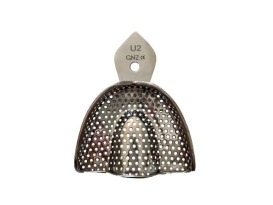 Cubeta perforada U2 en acero inoxidable esterilizable, ideal para impresiones dentales precisas y seguras en clínicas y laboratorios odontológicos.