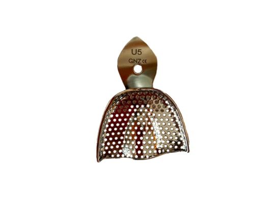 Cubeta perforada U5 de acero inoxidable, duradera y esterilizable, ideal para impresiones dentales precisas y seguras, con diseño ergonómico para mayor comodidad.