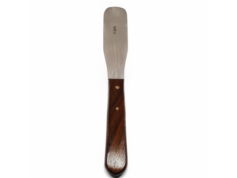 Espátula curva metálica con mango de madera, ideal para mezclar alginato con precisión y comodidad en odontología y modelado profesional.