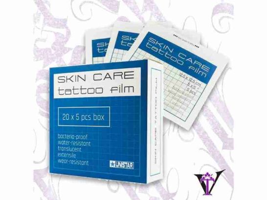Mantén tu tattoo protegido y limpio con UNISTAR Skin Care Tattoo Film. Autoadhesivo, antibacteriano y ultra flexible para una curación óptima. Set de 5 unidades de 12,5x12,5cm.