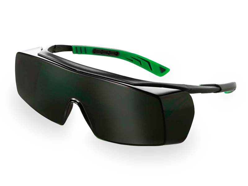 Gafas de protección frente a múltiples longitudes de onda láser, fabricadas en un policarbonato analérgico en color verde.