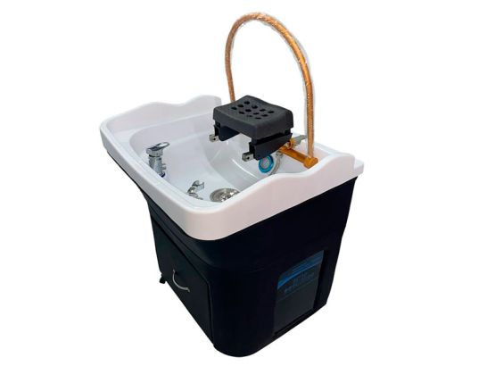 - Materiales: Lavacabezas de PVC resistente y base de madera recubierta de polipiel negra.