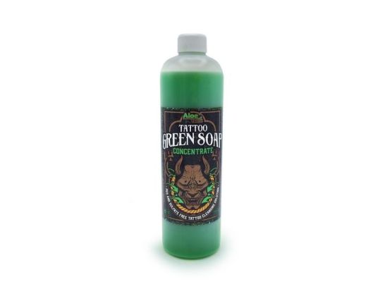 - Preparación: Para obtener 5 litros de jabón verde, mezclar 4,5 litros de agua destilada con una botella de Green Soap Concentrate AloeTattoo. Para obtener 1 litro de jabón verde, mezclar 900cc de agua destilada con 100cc de Tattoo Green Soap Concentrate AloeTattoo.