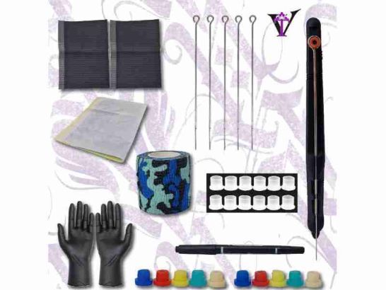 - El kit incluye: 1 Bolígrafo Manual para tatuar, 1 Venda Camuflaje Azul, 2 Guantes Negros, 50 Cups, Servilletas/Babero Negro, Grommets de Colores, Rotulador Negro y Agujas Soldadas.