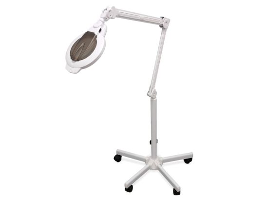 Lámpara lupa LED de 3 aumentos con lente de cristal para estética. Incluye base rodable, brazo articulado ajustable y cubierta antipolvo. Bajo consumo (5,5W), multivoltaje y gran estabilidad (5,8 kg).
