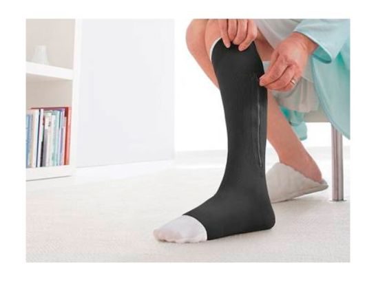 Características de la media: Está diseñada para la autogestión del paciente. Permite una fácil colocación sobre el calcetín. Tiene el talón y los dedos abiertos integrados. Está disponible con y sin cremallera. Se puede lavar a 40ºC.