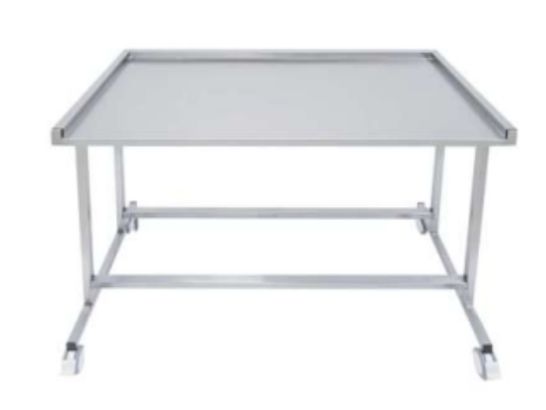 Mesa instrumental de acero inoxidable, con bandeja extraíble y ruedas para mayor movilidad. Ideal para laboratorios y entornos profesionales.