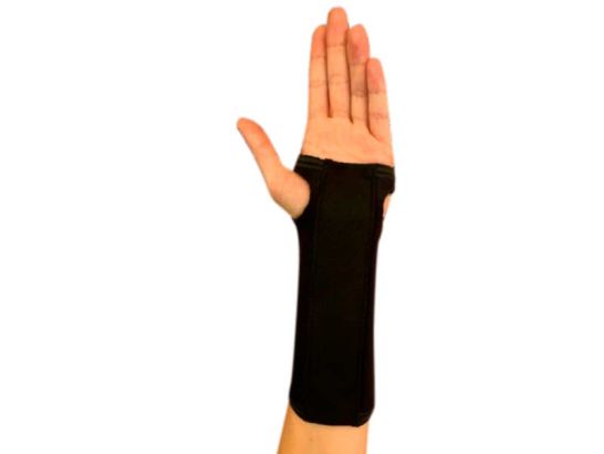 - Posee una férula palmar extraíble inmovilizando la muñeca y dos orificios para la colocación del dedo pulgar