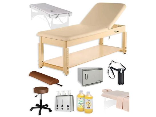 Todos los elementos del paquete son de calidad profesional, lo que garantiza durabilidad y rendimiento. La camilla de masaje fija de madera, por ejemplo, está diseñada para un uso intensivo y ofrece una comodidad óptima tanto para el profesional como para el cliente.