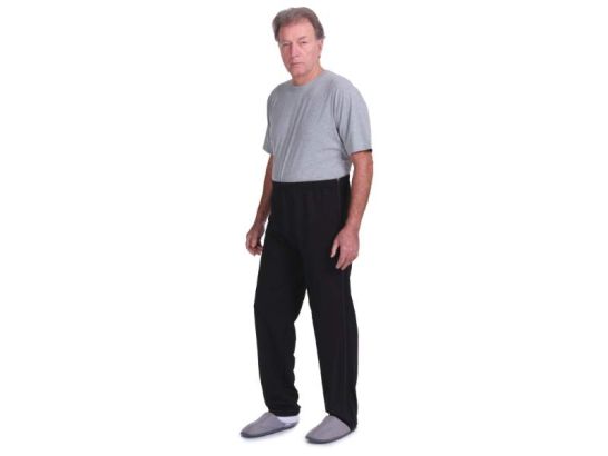 Pantalón que puede abrirse completamente desde la cintura hasta el tobillo gracias a las cremalleras laterales a ambos lados. Adecuado para la rehabilitación postoperatoria.