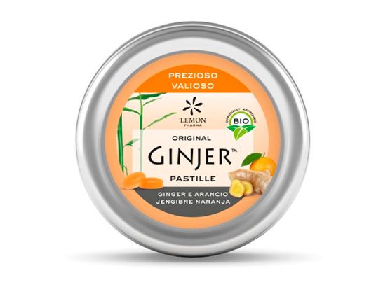 Pastillas de jengibre - naranja con certificación ecológica. Elaboradas artesanalmente con jugo de acacia natural y con un sabor de larga duración. Ideales para cuidar la salud de la boca y la garganta. Viene en una lata de 40g.