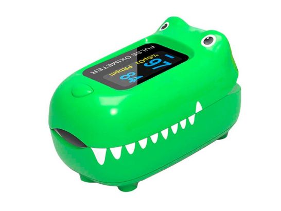 Pulsioxímetro pediátrico Oxy-0 en forma de cocodrilo. Medida divertida de salud para tus pequeños, con pantalla LCD colorida y resultados claros. ¡Cuidado y diversión en uno!