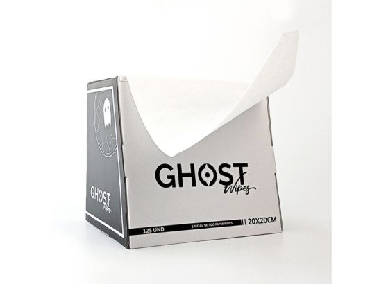 Toallitas GHOST Tattoo Wipes: súper absorbentes, 20x20 cm, 125 unidades. En envase innovador para prevenir contaminación cruzada. ¡Prácticas y eficientes!