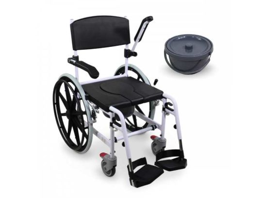 Fabricada con una estructura de aleación de aluminio resistente e impermeable, esta silla está diseñada para durar y soportar el uso diario en condiciones de humedad, como baños o duchas. Las ruedas traseras autopropulsables de 24 pulgadas permiten al usuario moverse con mayor independencia, mientras que las ruedas delanteras cuentan con frenos para garantizar una estabilidad óptima durante su uso.