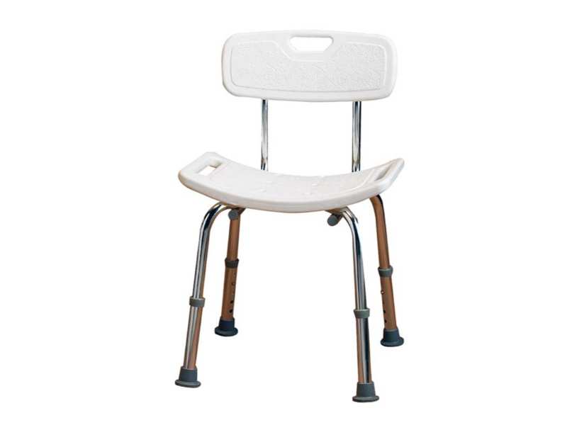 Silla de ducha fabricada en en aluminio y plástico, materiales totalmente inoxidables. Muy ligera, ergonómica gracias a su asiento ligeramente curvado y con asas para mayor seguridad. Patas regulables en altura. Con conteras de caucho para darle mayor seguridad y estabilidad.